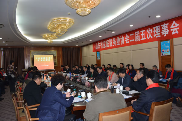 山东省家庭服务业协会二届五次理事会于2015年1月23日在山东济南召开。会议由孔卫东会长主持,省商务厅商贸服务处王占英处长、省家庭服务业协会副会长兼秘书长张天南、副会长张吉发、张珠银等出席会议。